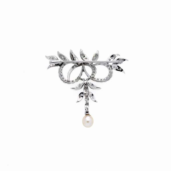Spilla pendente floreale in oro bianco 18 kt, diamanti e perla coltivata