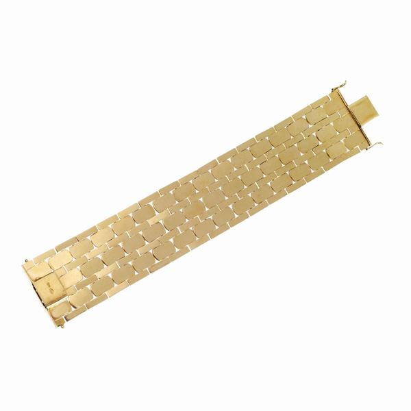 Aperto lunghezza cm 18.5Il bracciale, a maglie bombate in oro satinato e a alternate a maglie a barretta, reca il marchio 750, gr 82.3