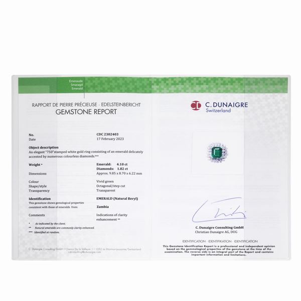 Misura 15Anello con diamanti taglio brillante per ct 1.82, colore G, VS e smeraldo taglio rettangolare di ct 4.10, reca marchio 750, corredato da Certificato Gemmologico Dunaigre n. CDC 2302403 del 17/2/2023,gr 10.7