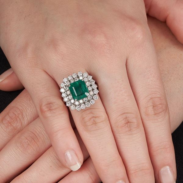 Anello a margherita in oro bianco 18 kt, diamanti e smeraldo Zambia