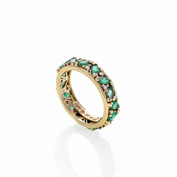 Anello eternity in oro giallo 18 kt, diamanti e smeraldi