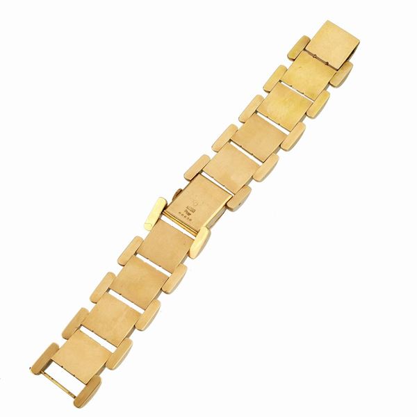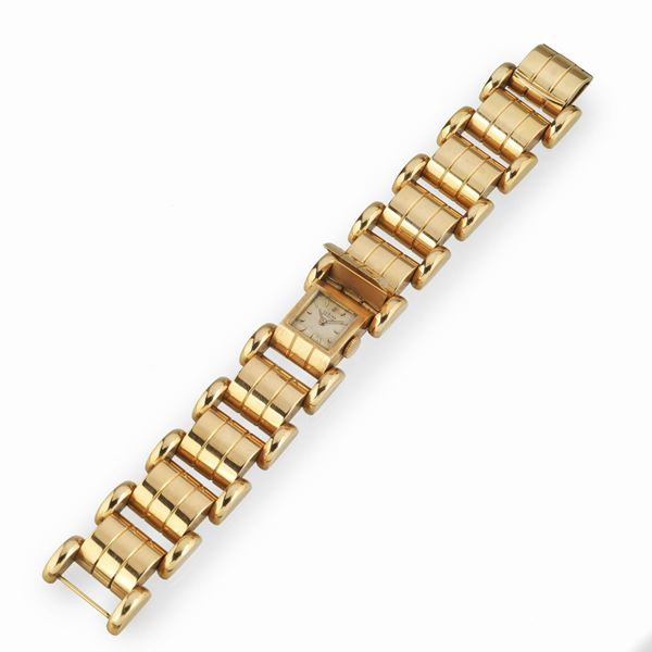 Cassa mm 16x23, lunghezza aperta cm 18Bracciale a maglie bombate, nella maglia centrale è nascosta la cassa dell'orologio, il quadrante argentè con indici applicati, movimento a carica manuale, gr 84.7