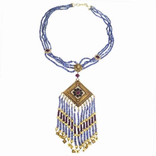aperta cm 39 , elemento pendente lunghezza cm 16Collana molteplici fili di zaffiri trattenuti ai lati da elementi in oro, diamanti e rubini, al centro grande pendente in oro cesellato, rubini, zaffiri e diamanti con frangia in zaffiri, rubini ed elementi in oro sbalzato e cesellato, diamanti taglio huit huit e taglio vecchio per ct 0.30 circa, gr 84.4