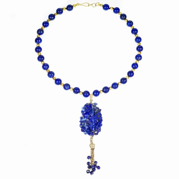 Misura collana aperta cm 45, pendente cm 12Collana a sfere in lapislazzuli diametro mm 10 intercalate da sferette sfaccettate in oro, pendente in lapislazzuli intagliato, il pendente reca marchio 750, g 74.6
