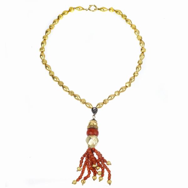 Misura collana aperta cm 46, pendente cm 11 hCollana a sferette sfaccettate e navette in oro, pendente a nappa in oro e corallo, g 47.6