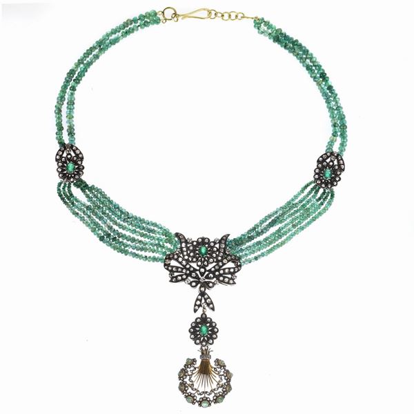Collana in oro giallo 18 kt, oro a basso titolo, argento, diamanti e smeraldi