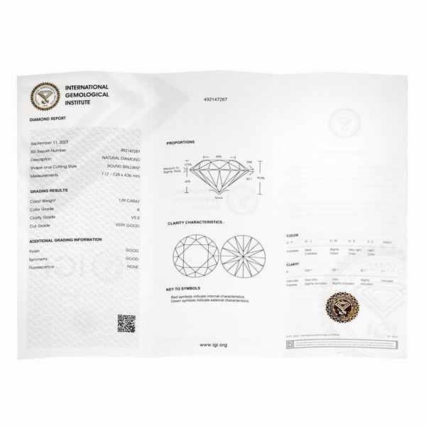 Diamante di ct 1.39, colore K, VS2, corredato di certificato IGI num. 492147287 del 11.09.2023
