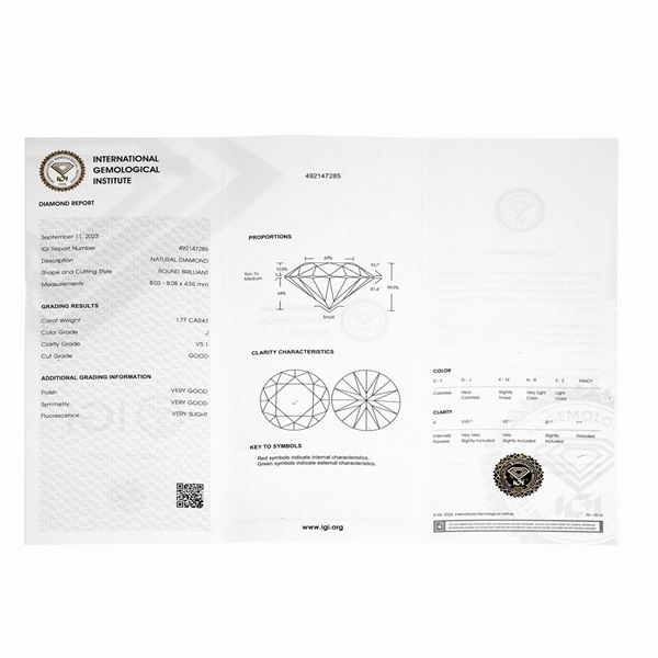 Diamante di ct 1.77, colore J, VS1, corredato di certificato IGI num. 492147285 del 11.09.2023