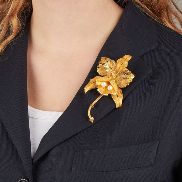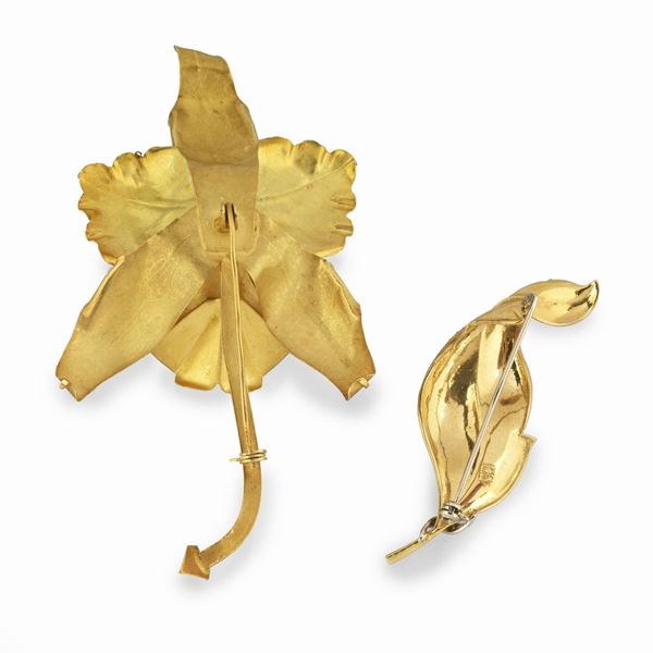 Orchidea cm 5.3x10.2, foglia cm 2.5x6La spilla a orchidea è in lamina d'oro 18 kt con perle coltivate diametro mm 6, la spilla a foglia reca il marchio 750, gr 30.4