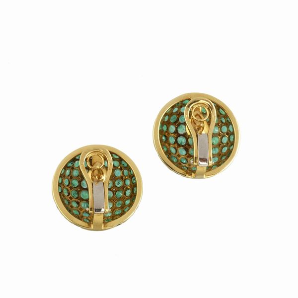Grandi orecchini a bottone in oro giallo 18 kt, diamanti e smeraldi