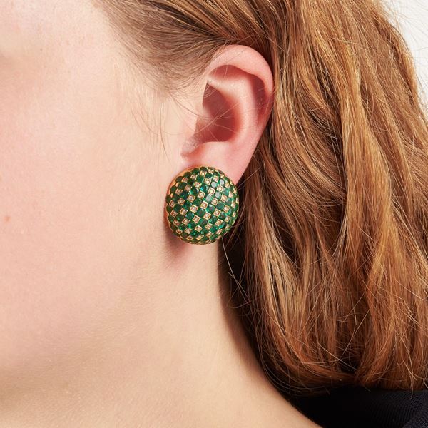 Diametro cm 2.4Grandi orecchini con diamanti taglio brillante per ct 1.0, colore H, VS-SI e smeraldi taglio rotondo per ct 9.60, recano il marchio 750, gr 19.7