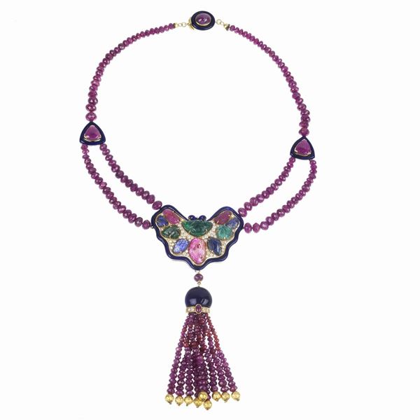 lunghezza aperta cm 43, lunghezza nappa cm 8.5Collana in rubini sfaccettati con nappa e grande elemento centrale decorato con radici di rubino, smeraldo e zaffiri incise a foglie, diamanti per ct 1.50, colore I, SI, e pietre di colore parte delle quali incise a foglie, gr 111.3