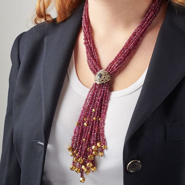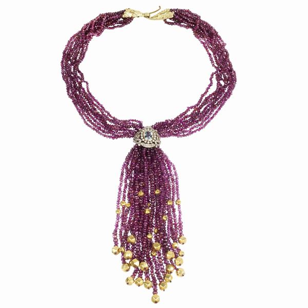 Colla aperta cm 47.5, lunghezza nappa cm 15Collana multifilo in granati con grande nappa arricchite da sferette sfaccettate in oro giallo trattenuta da un elemento traforato interamente decorato in diamanti taglio vecchio e huit huit per ct 1.50 circa e centrato da un'acquamarina ovale, gr 188.0