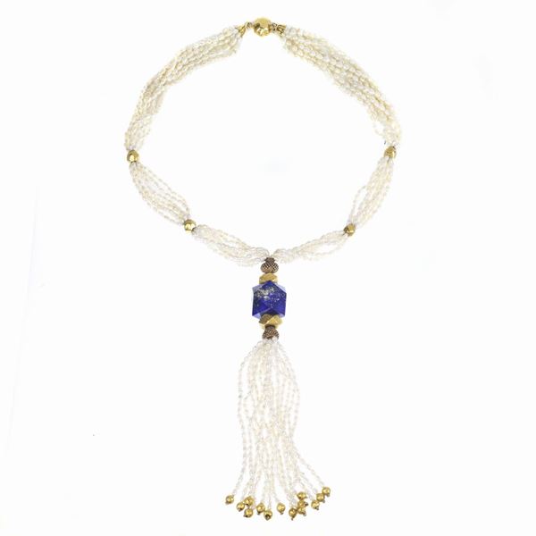 lunghezza aperta cm 52-5, pendente cm 18 hCollana a sette fili di perle di fiume con elementi a sfera sfaccettata in oro e lapislazzuli con grande nappa pendente, la fermatura reca punzone 750, gr 107.6