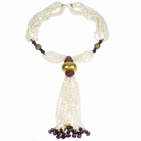 Misura collana aperta cm 57, lunghezza nappa cm 20Collana multifilo in perle di fiume con lunga nappa, arricchita da sfere in oro, radici di rubino e zaffiro sfaccettate, al centro grande sfere schiacciata in oro giallo affiancata da due anelli sagomati in oro rosa, zaffiri e rubini, gr 318.2