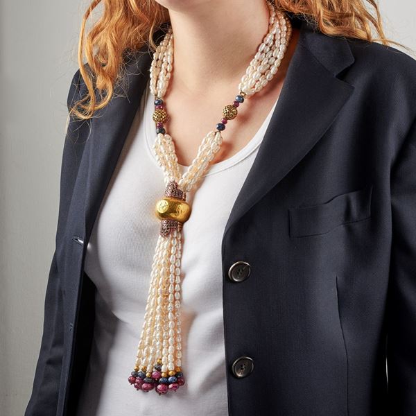 Lunga collana in oro giallo e oro rosa 18 kt, perle di fiume, zaffiri e rubini