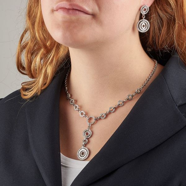 catena aperta cm 42, lunghezza pendente cm 5.4, lunghezza orecchini cm 2.7Parure composta da collana con pendente fisso e paio di orecchini, gli anelli concentrici interni sono girevoli, recano marchio 18 k e 750, diamanti taglio brillante per ct 4.70, colore H-I, SI, gr 50.5