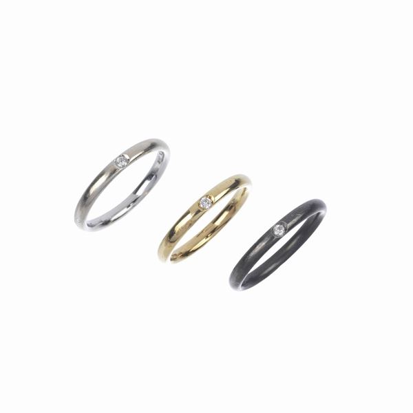 Misura 11Tre anelli ciascuno firmato Pomellato, recano il marchio 750, gr 6.4, corredati di scatola originale
