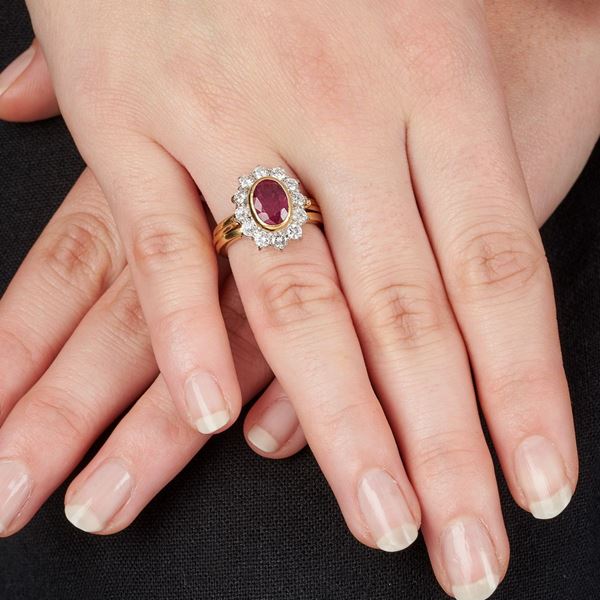 Anello a margherita in oro giallo 18 kt, oro bianco, diamanti e rubino