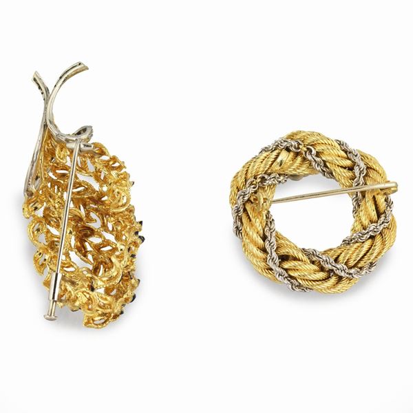 Spilla Foglia in oro giallo 18 kt, diamanti e smalto e spilla Ghirlanda in oro giallo e bianco 18k