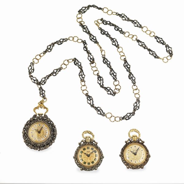 Diametro mm 33 il più grande, gli altri mm 27, lunghezza catena cm 42.5 chiusaCasse riccamente decorate con smalti guillochè blu e verde ed inserti in argento e oro cesellati impreziositi con rubini e rose di diamante, i quadranti dorati cesellati a volute, con numeri romani entro riserve smaltate, la lunga catena da orologio eseguita a maglie cesellate in argento e oro, gr 97.6