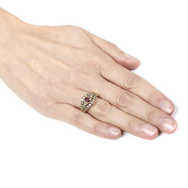 Anello a fascia in oro giallo 18 kt, diamanti e rubino