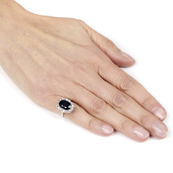 Misura 7zaffiro taglio ovale di ct 4.40, diamanti taglio brillante per ct 0.80, colore G-H, SI, gr 4.8
