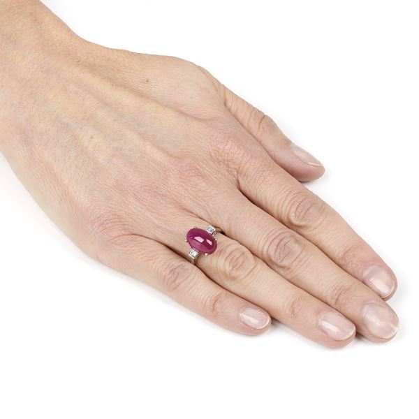 Misura 13Rubino taglio cabochon di ct 8.23, diamanti taglio trapezio per ct 0.10, gr 5.2