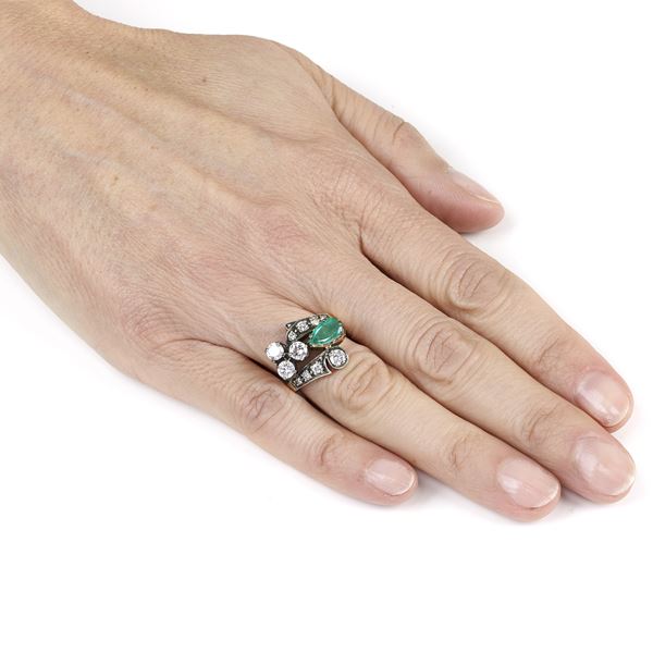 Anello in oro giallo 18 kt, argento, diamanti e smeraldo