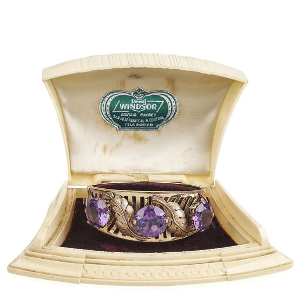 Bracciale rigido in oro rosa e giallo a 12 kt e tre zaffiri sintetici cambio colore