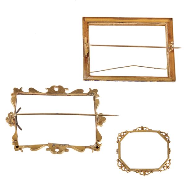 Due cornici rettangolari a spilla in oro giallo 18 kt e smalti e altra cornice in oro giallo 9 kt
