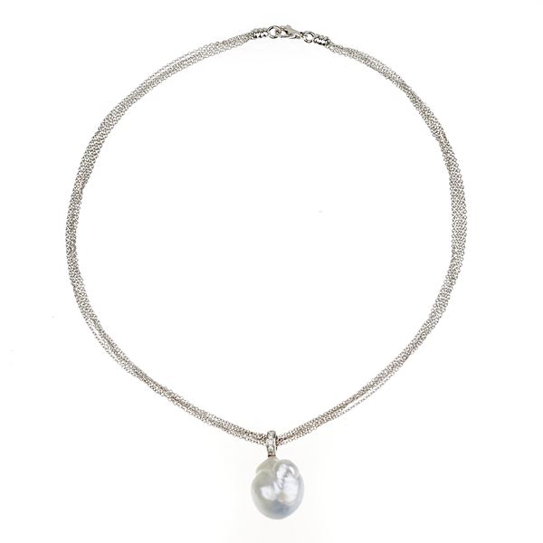 Girocollo millefili in oro bianco 18 kt, diamanti e perla scaramazza pendente