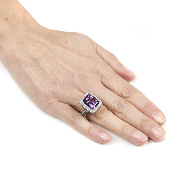 Misura 12diamanti taglio brillante per ct 3.70, diamanti bianchi colore H, SI e ametista taglio rettangolare di ct 8.0 circa, reca marchio 750, gr 16.1