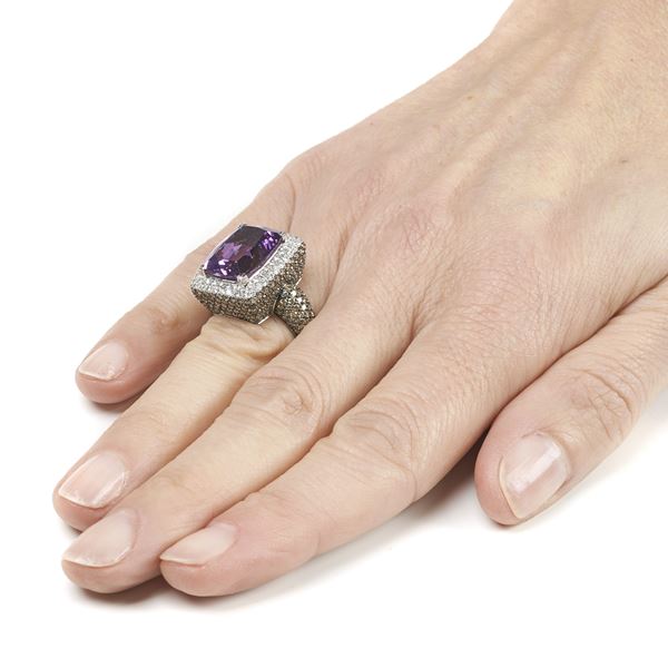 Grande anello in oro bianco 18 kt, diamanti, diamanti brown e ametista