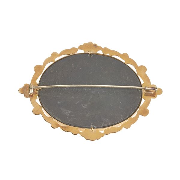 Grande spilla con commesso in pietra dura con fiori e oro giallo 18 kt