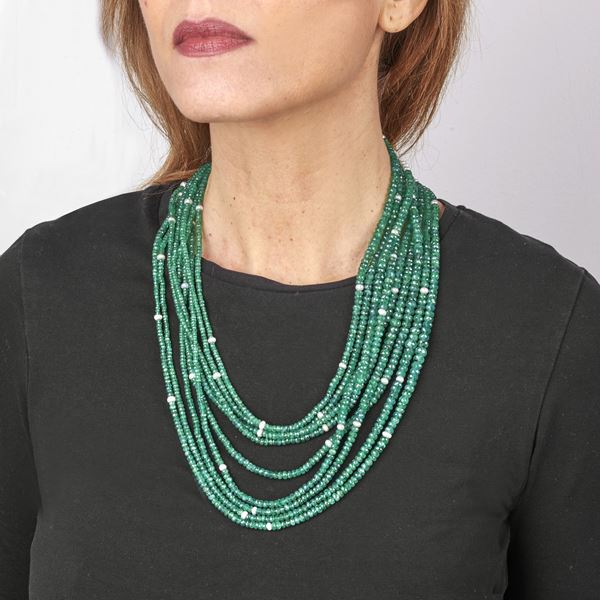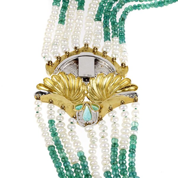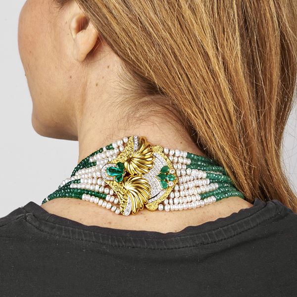 Importante collana in oro giallo e oro bianco 18 kt, diamanti, perle e smeraldi