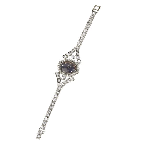 Cassa mm 2.3 x 1.8, aperto lunghezza cm 16cassa con fondello a scatto, recante numero 12480520, lettera A e punzone dell'oro, movimento a carica manuale, funzionante, ossidazioni sul quadrante, corona e bracciale con diamanti taglio brillante per ct 6 circa, colore H, VS, corredato di scatola originale, gr 32.4