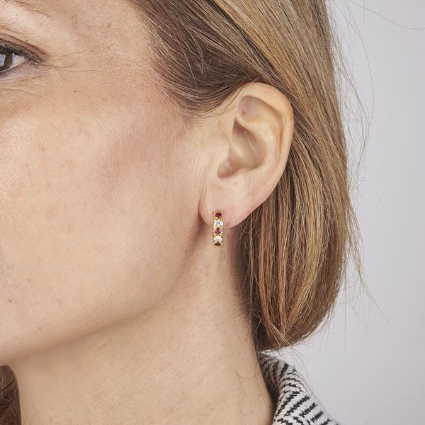 Paio di orecchini a semicerchio in oro giallo 18 kt, diamanti e rubini