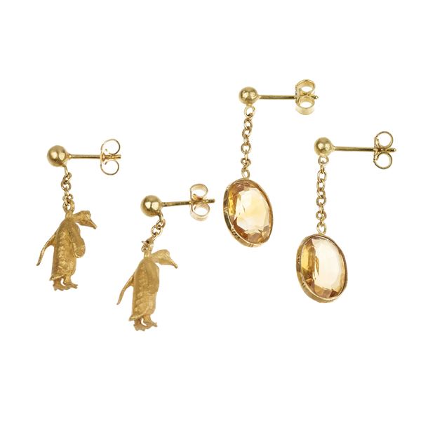 Paio di orecchini con pinguino in oro giallo 18 kt e un altro in oro giallo 18 kt e quarzo citrino