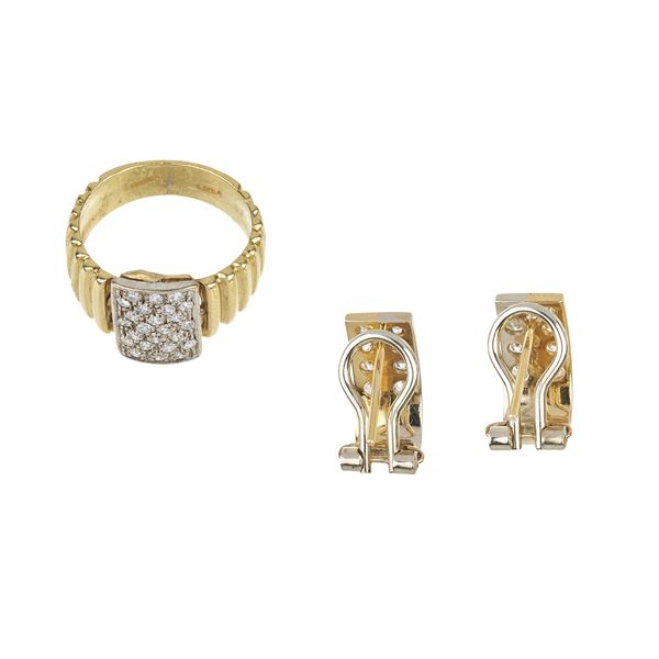 Paio di orecchini in oro giallo, oro bianco e diamanti e anello in oro giallo 18 kt e diamanti