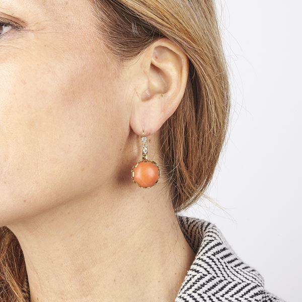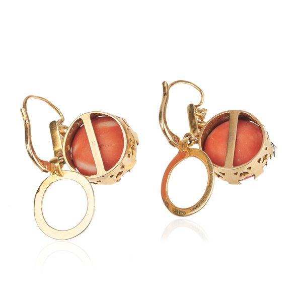 Paio di orecchini pendenti in oro giallo 18 kt, pietre incolori e corallo rosso