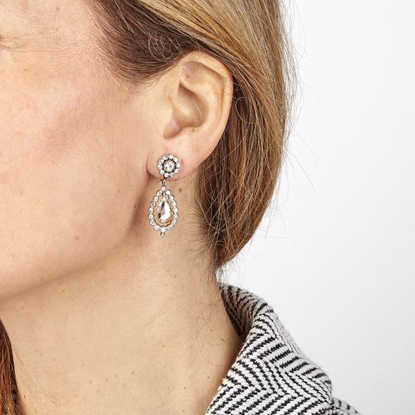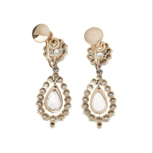 cm 1.3 x 3.5 hdue diamanti taglio goccia rosa coronè per ct 0.80, due diamanti taglio vecchio e huit huit per ct 2, colore G:H, VS-SI, gr 10.1