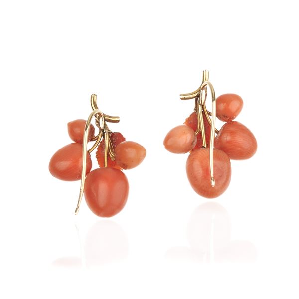 Paio di orecchini pendenti in oro rosa 18 kt e corallo rosso scolpito come foglie