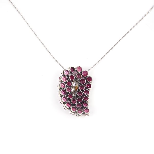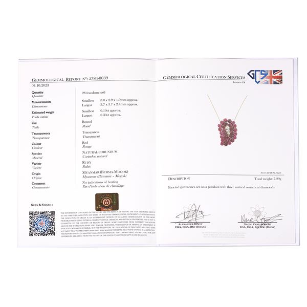 Pendente cm 2 x 2.6 h, catena aperta cm 47rubini sono ct 5 circa e sono corredati di certificato Gemmological Service, Londra, num. 5781-0039 del 04.10.2023, diamanti taglio brillante per ct 0.18, la catena reca il marchio del platino, gr 7.3