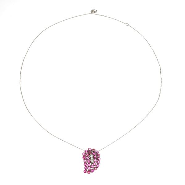 Pendente Piuma in oro bianco 12 kt , diamanti e rubini birmani naturali con catena in platino