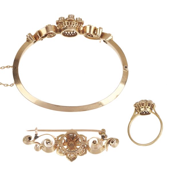 Spilla a barretta, bracciale rigido e anello in oro rosa 18 kt e diamanti