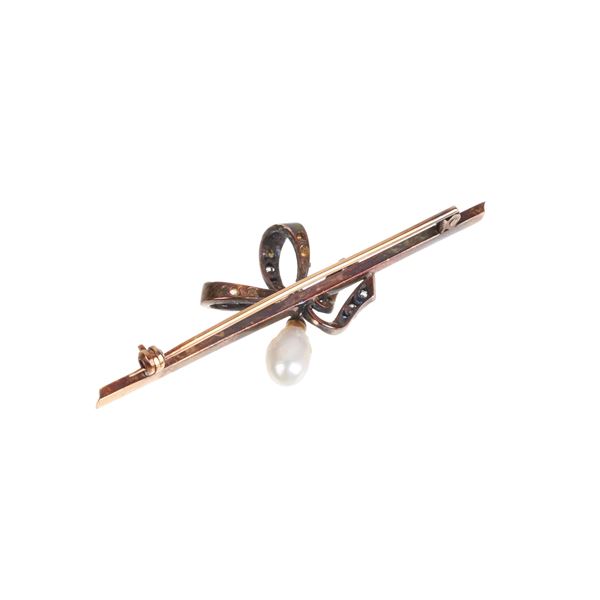 Spilla a barretta in oro 18 e 9 kt, argento, diamanti e perla scaramazza