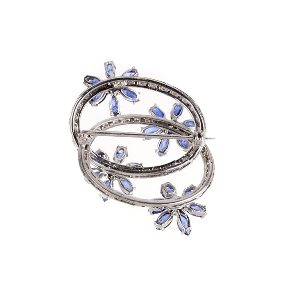 Spilla cm 3.5 x 4zaffiri taglio navette per ct 3.50 circa, diamanti taglio brillante per ct 0.80, colore G-H, SI, presenta un danno ed un diamante mancante, reca marchio 750, gr 9.6