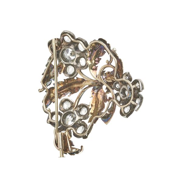Spilla floreale in oro giallo 14 kt, argento e diamanti