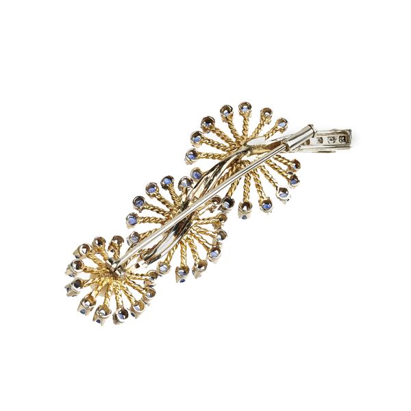 Spilla floreale in oro giallo, oro bianco, diamanti, zaffiri e perle coltivate